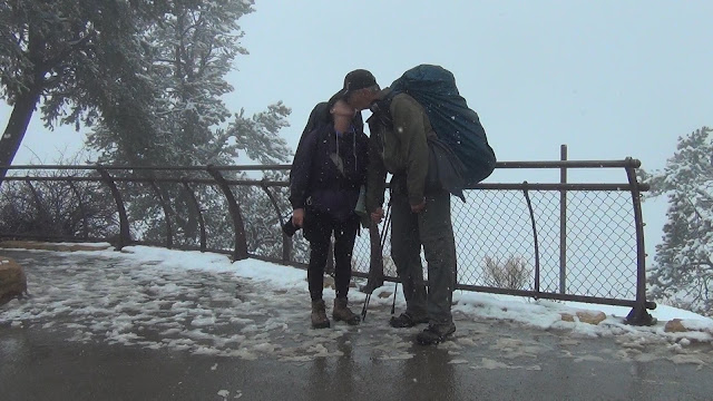 When we woke the next morning, we laid in our sleeping bags staring at the tent’s ceiling while mentally preparing ourselves for what we had ahead of us: a 3,000-foot gain in elevation over 4.5 miles. We got out to break down our Indian Garden camp just before the rain began to fall. This was no light, summer shower. Instead, it started as a cold, steady rain that soon turned to freezing hail and pellets. After an hour or so, this freezing rain turned to a steady snow.